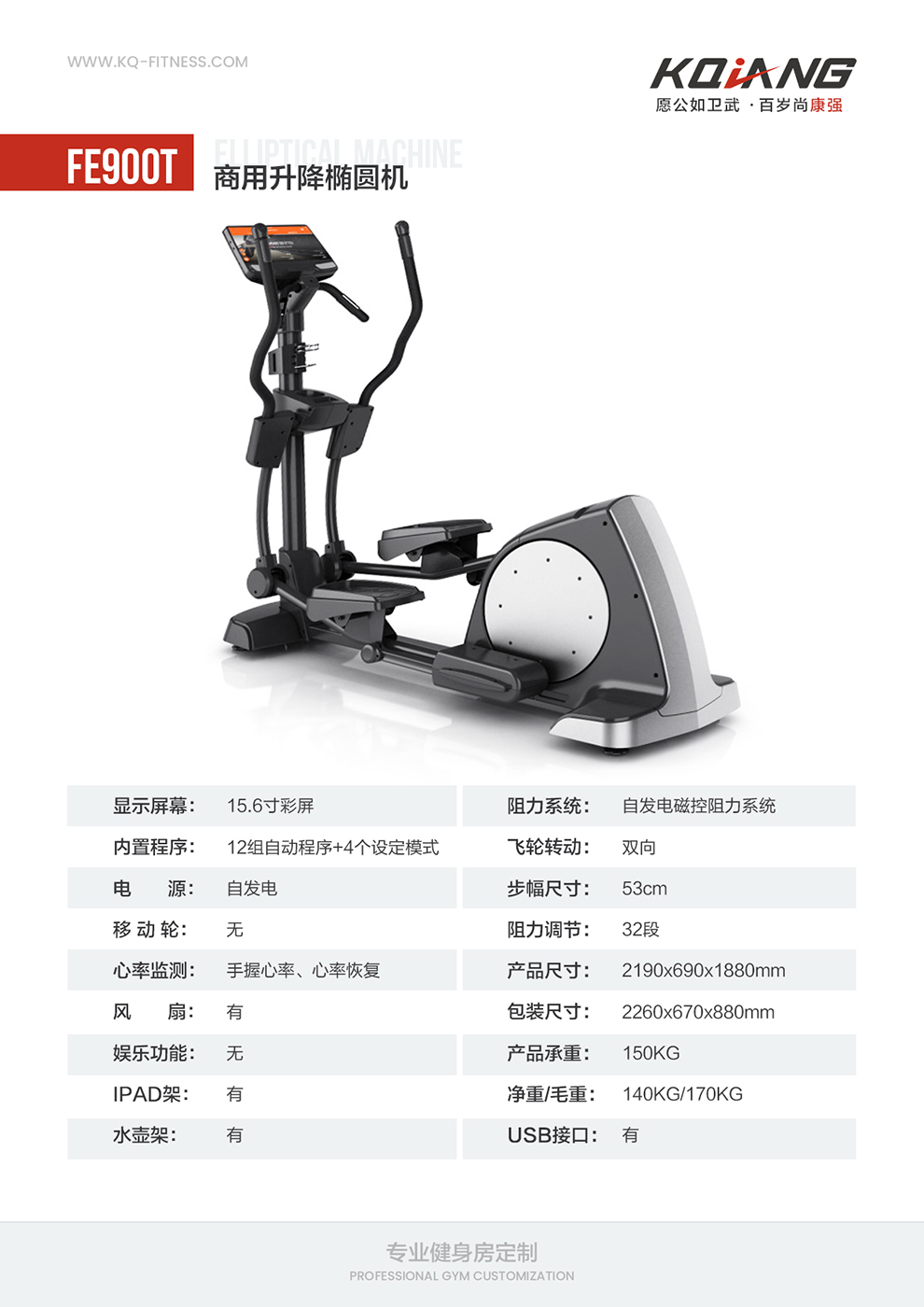 阻力控制:1-32段ENS自发电电磁系统 占地面积:2190*690*1880MM 扶手:带有手握心跳和心率恢复功能 载重:150kg